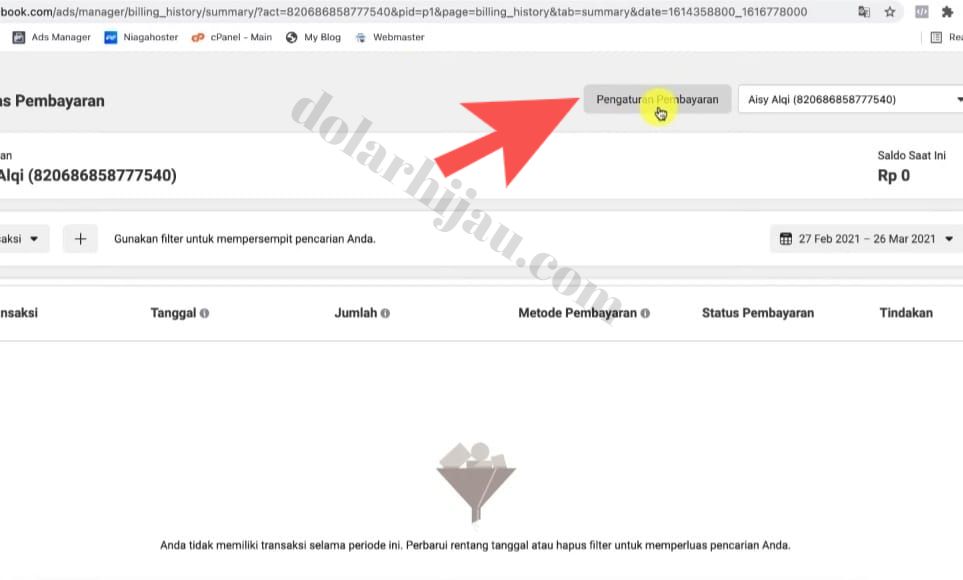 - Langkah pertama untuk isi saldo melalui bank transfer yaitu dengan membuka halaman pembayaran terlebih dahulu, kemudian klik tombol “Pengaturan Pembayaran” pada halaman Ads Manager Billing.